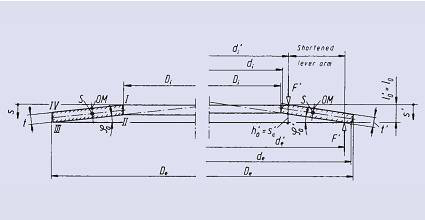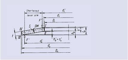 支撐面僅用于厚度大于6mm的碟形彈簧(DIN2093標準,第三組)。采用支撐面使彈簧承載面積增大,從而減少導向件與彈簧之間的摩擦。承載點也由外邊緣de變?yōu)閐e’,由內邊緣di變?yōu)閐i’。這種變化導致力臂縮短、載荷特性曲線變陡。如下圖