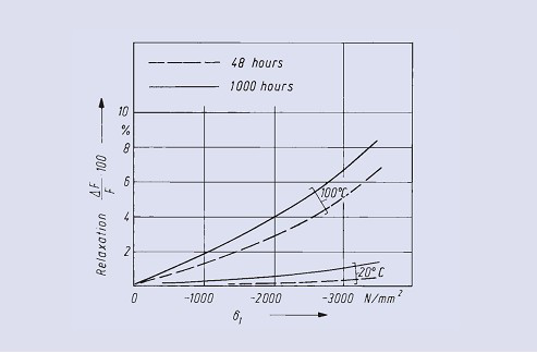 熱強(qiáng)壓彈簧表面殘余力與冷強(qiáng)壓彈簧基本相同,但其塑性變形區(qū)相比冷強(qiáng)壓彈簧來講,向材料內(nèi)部延伸的更深,因而其表面殘余應(yīng)力在深度方向的分布也更平緩,旨強(qiáng)壓處理時(shí)的載荷損失也就比冷強(qiáng)壓彈簧要小。冷強(qiáng)壓彈簧容許松弛量(見下圖)。工作溫度高于100℃的情況,請與Mubea公司聯(lián)系。